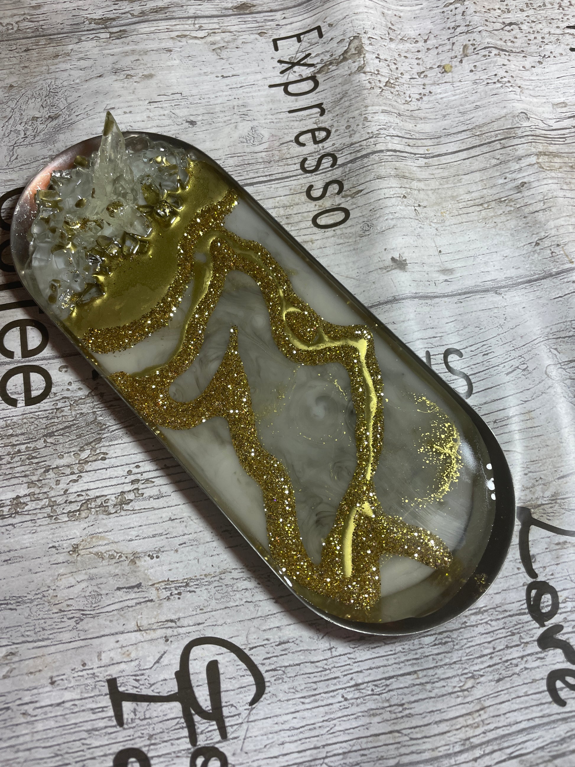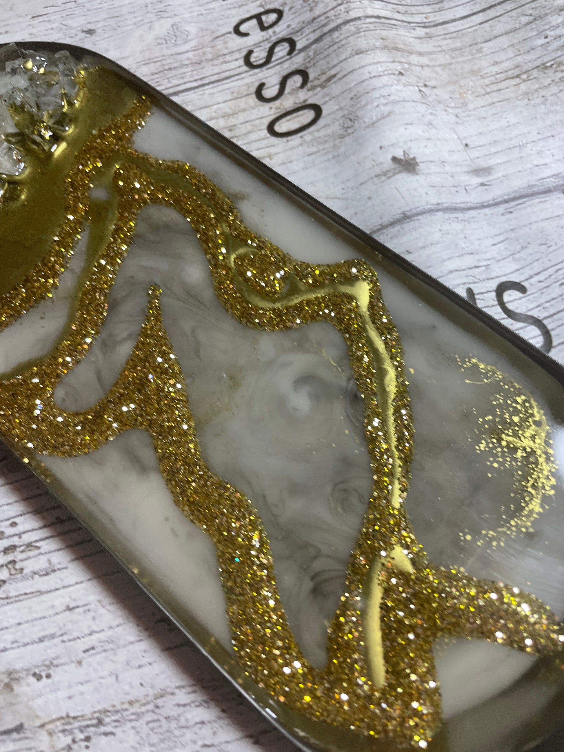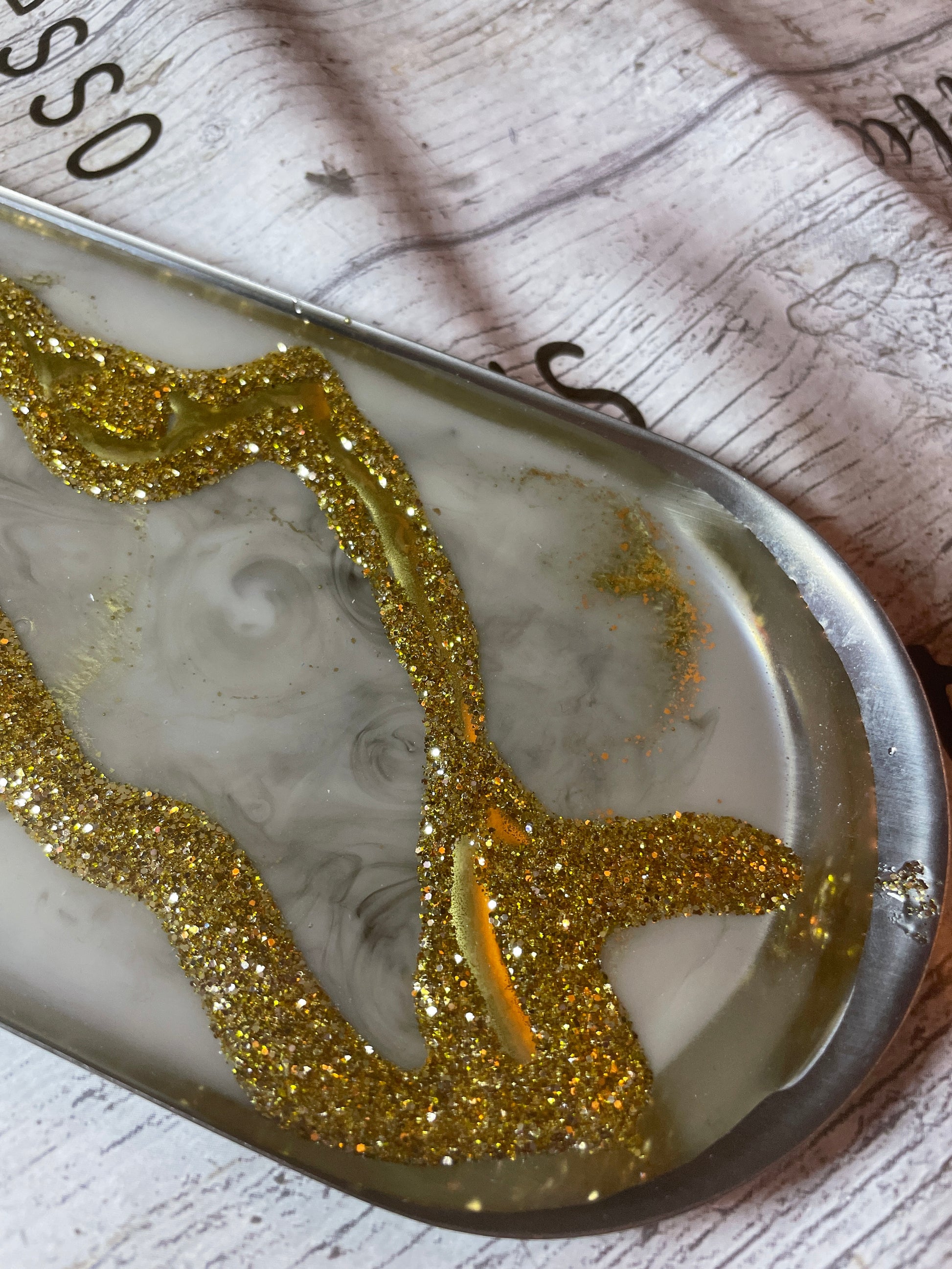 White, silver gold glitter and glasswork, Oval Silver Metal Resin Trinket Tray
