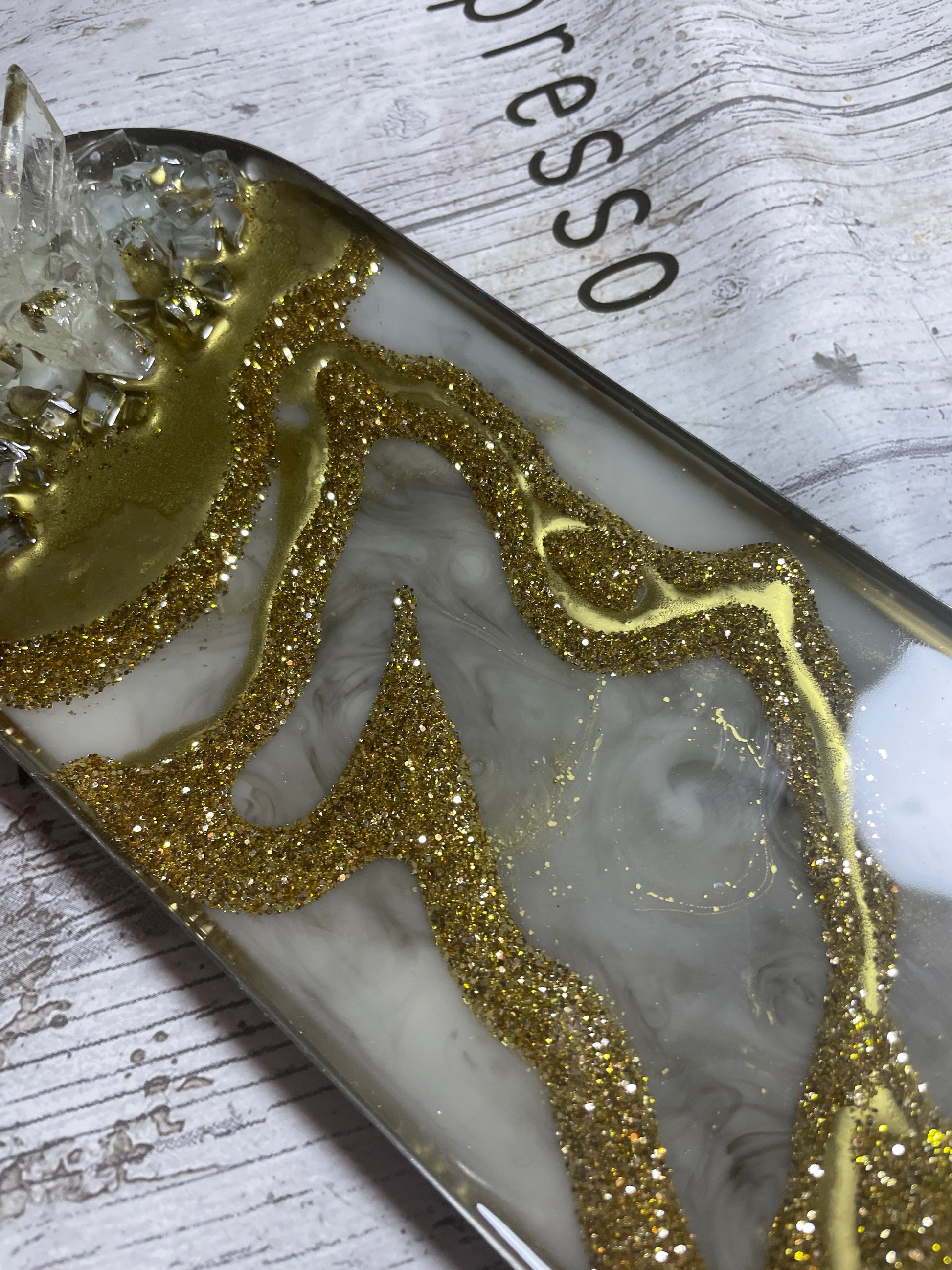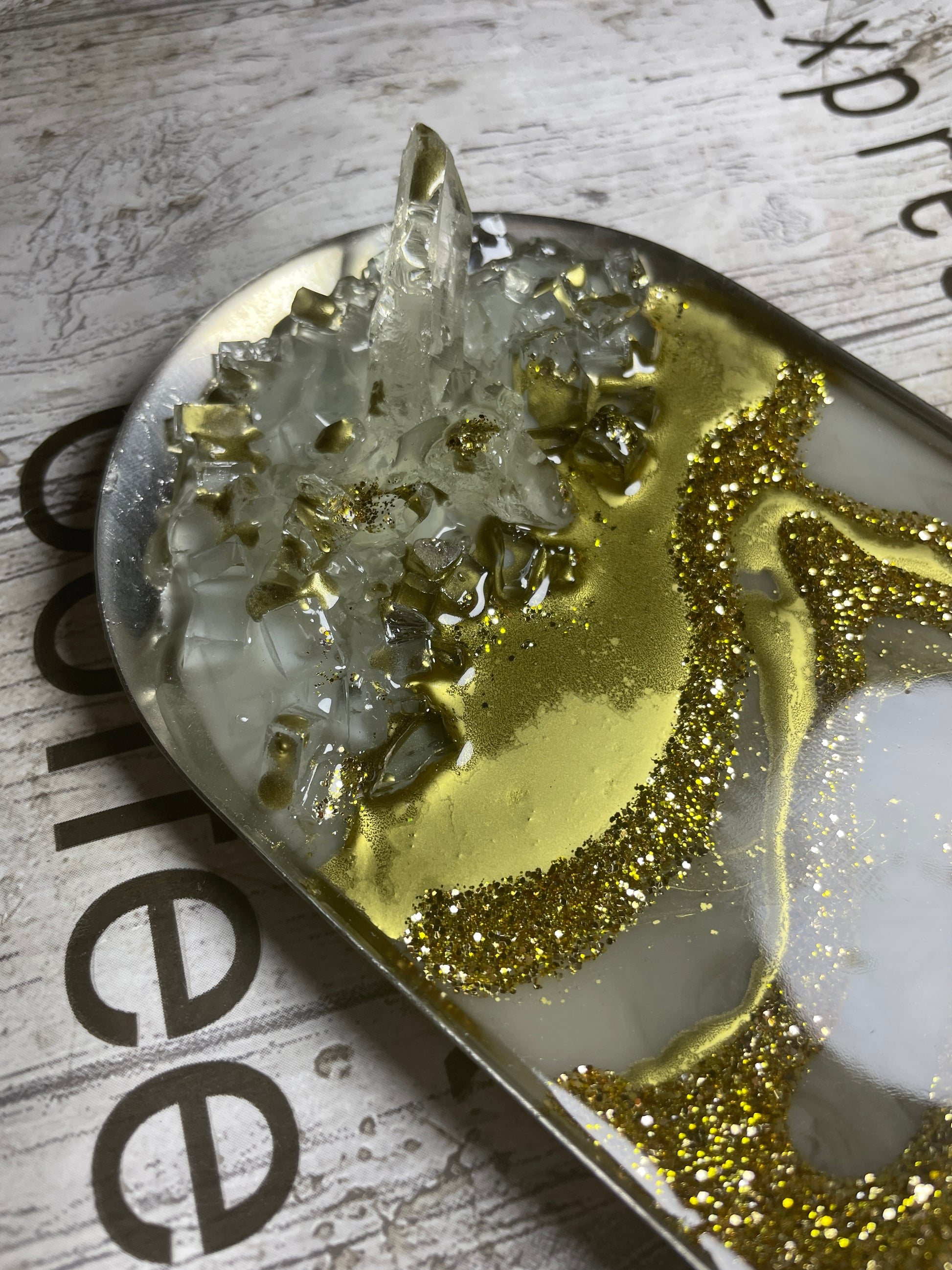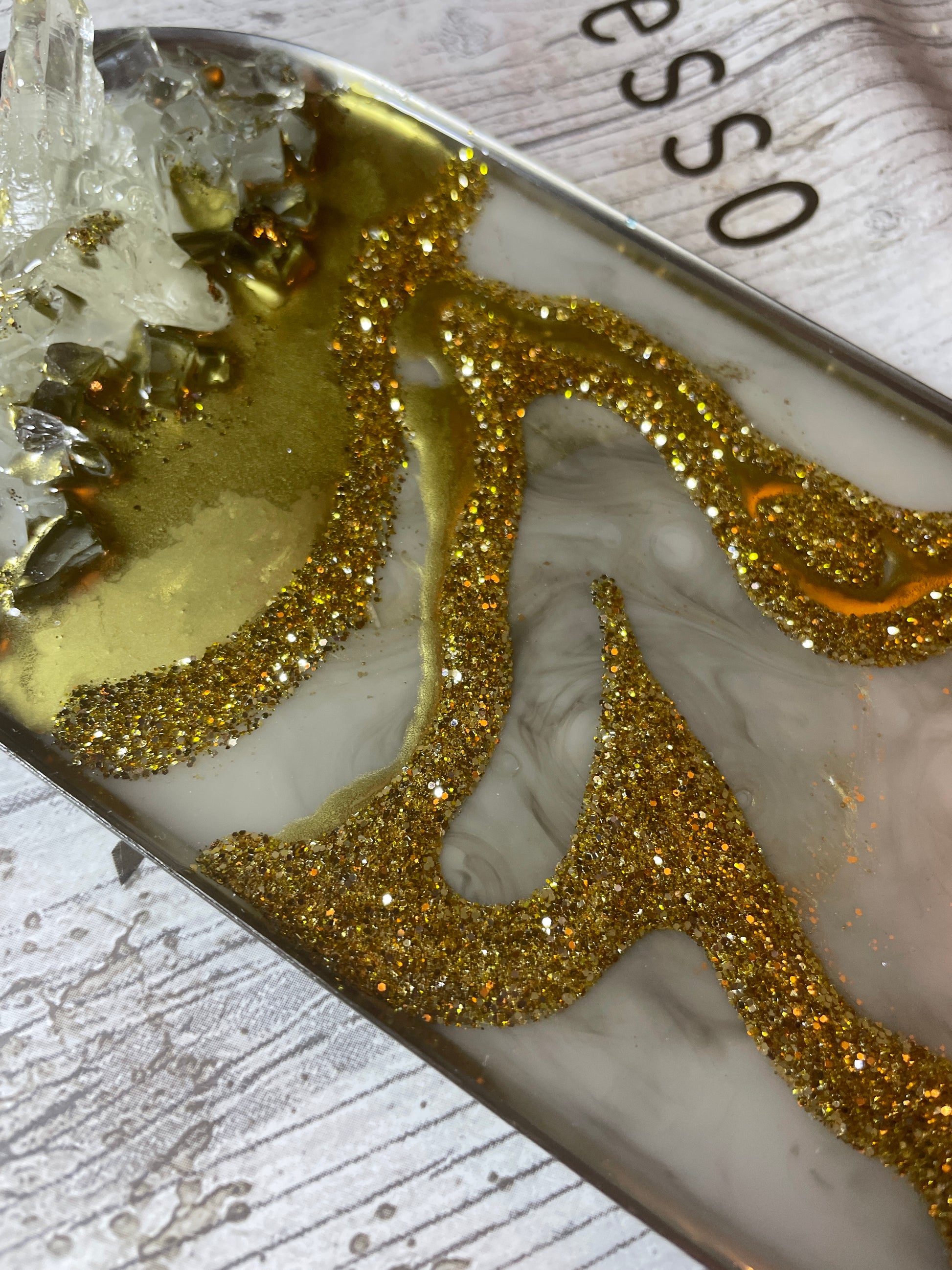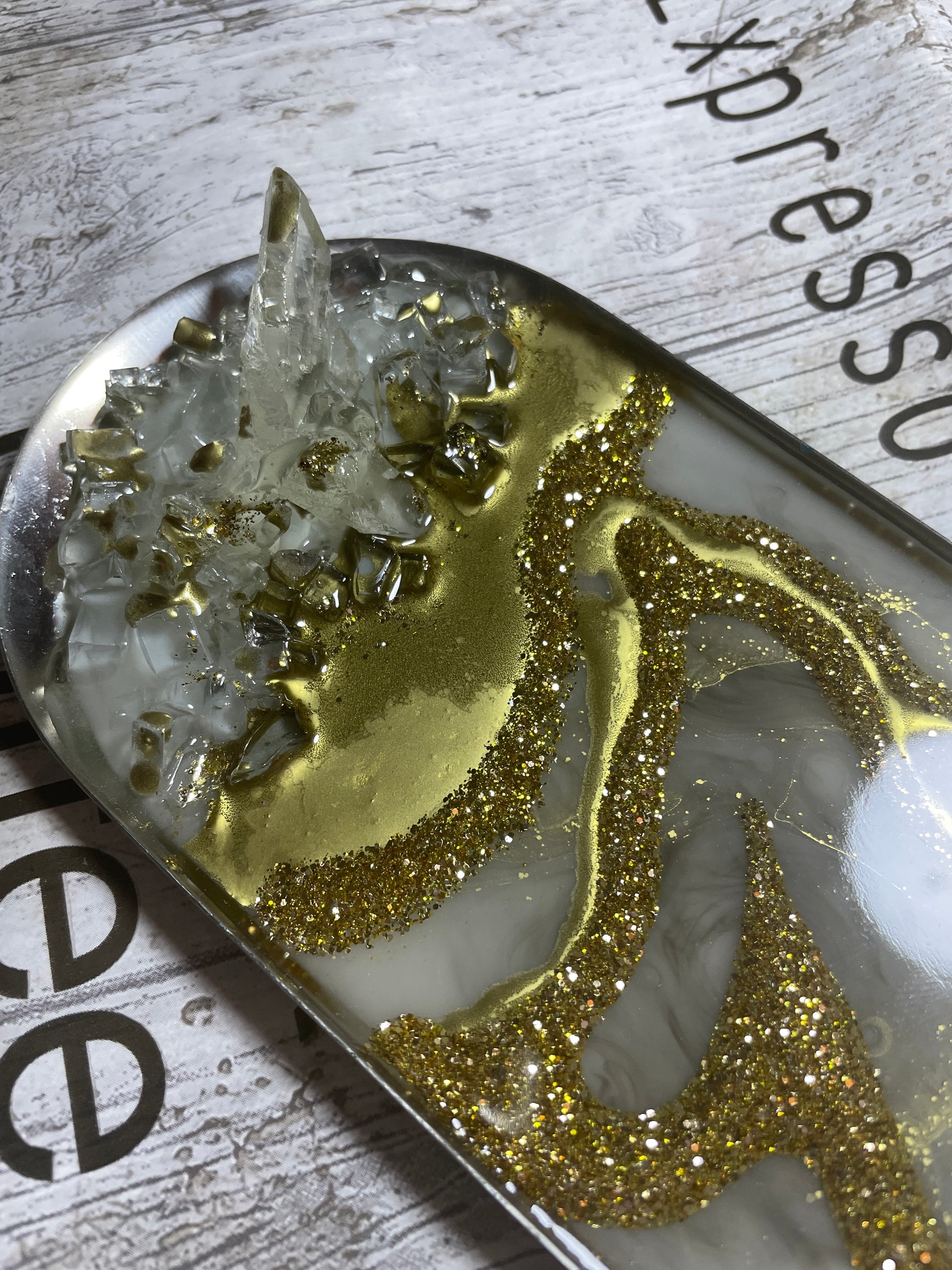 White, silver gold glitter and glasswork, Oval Silver Metal Resin Trinket Tray