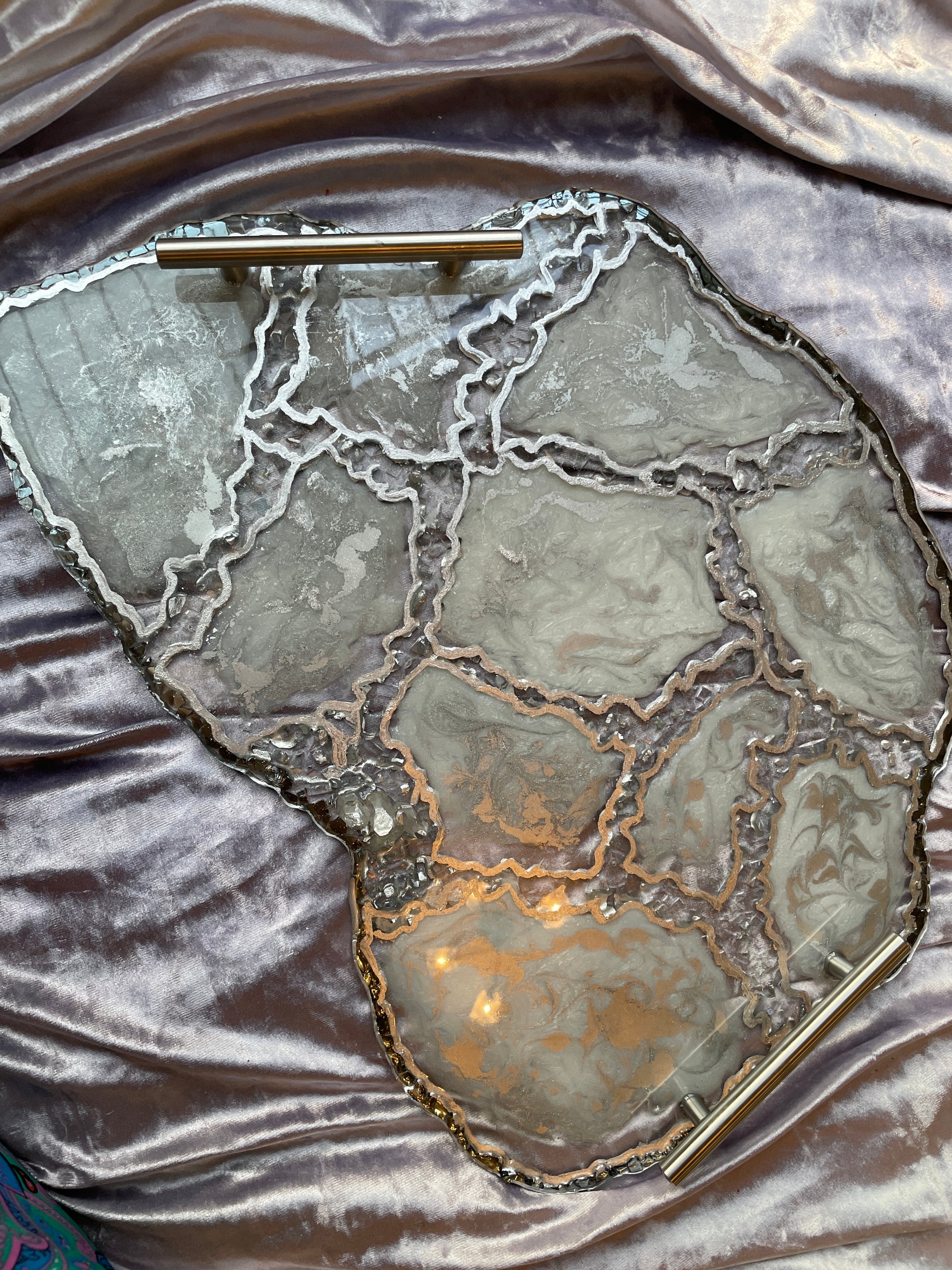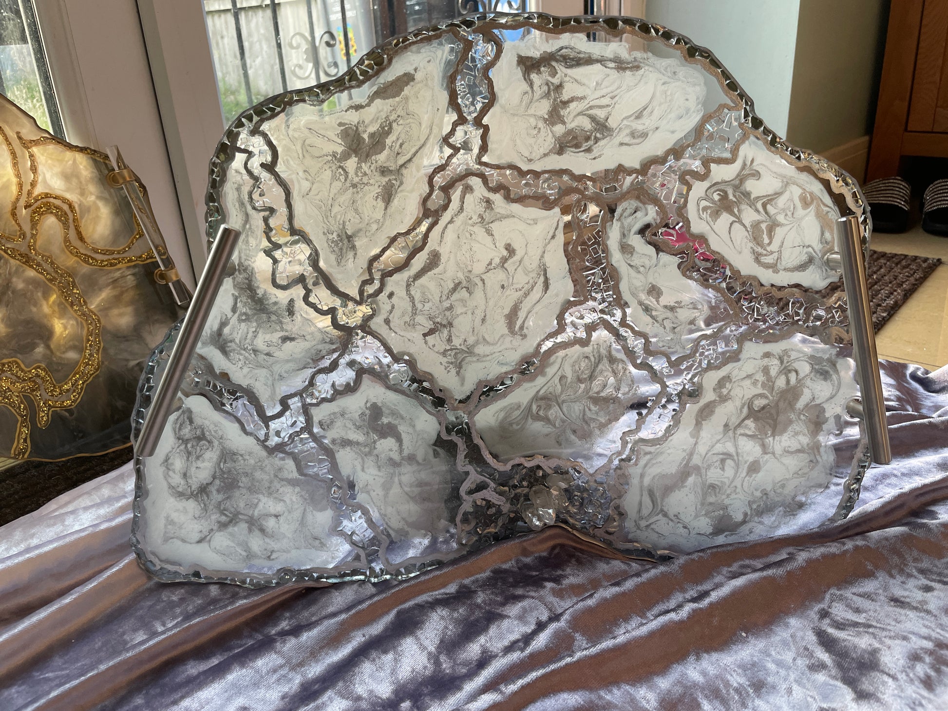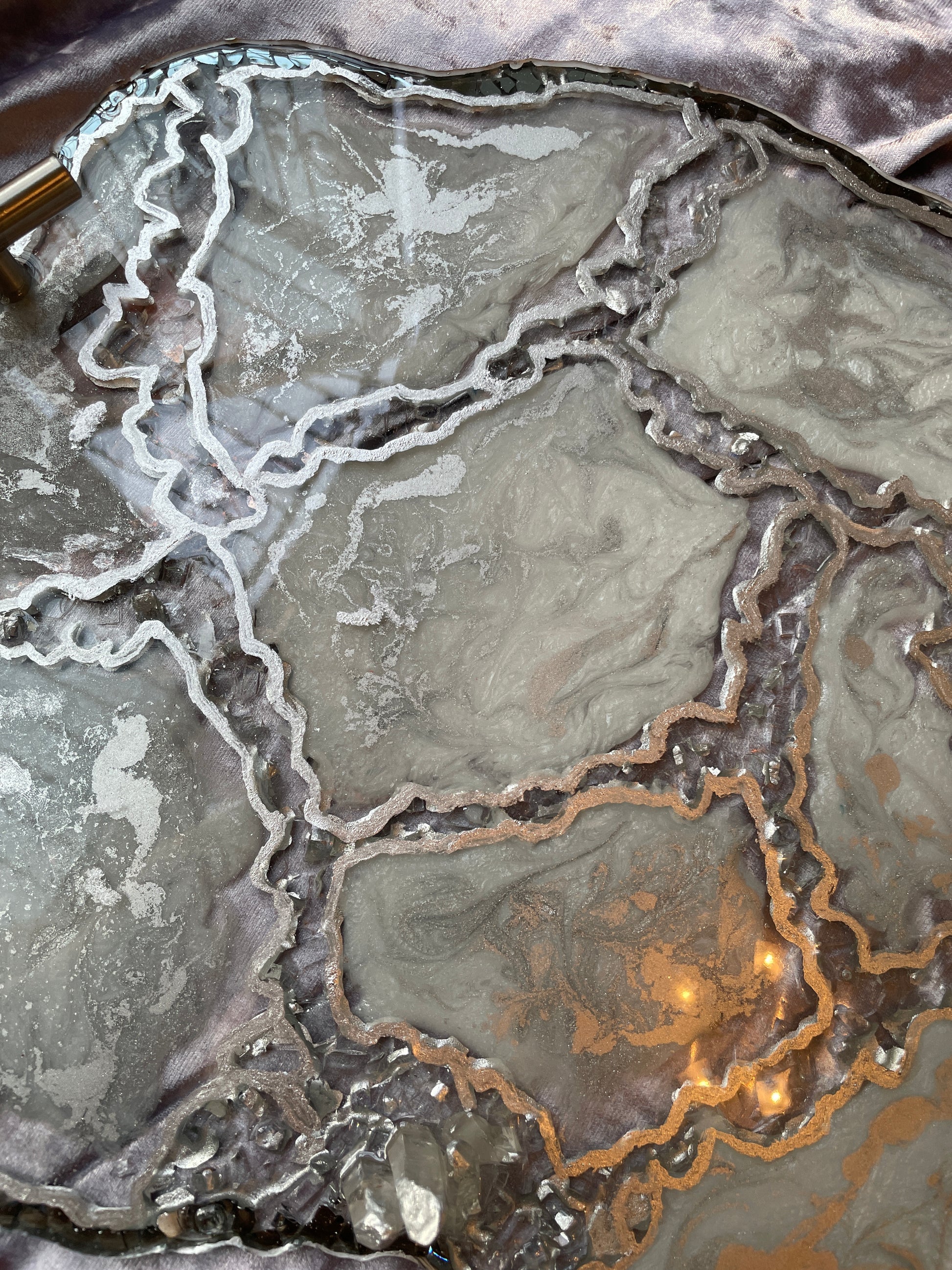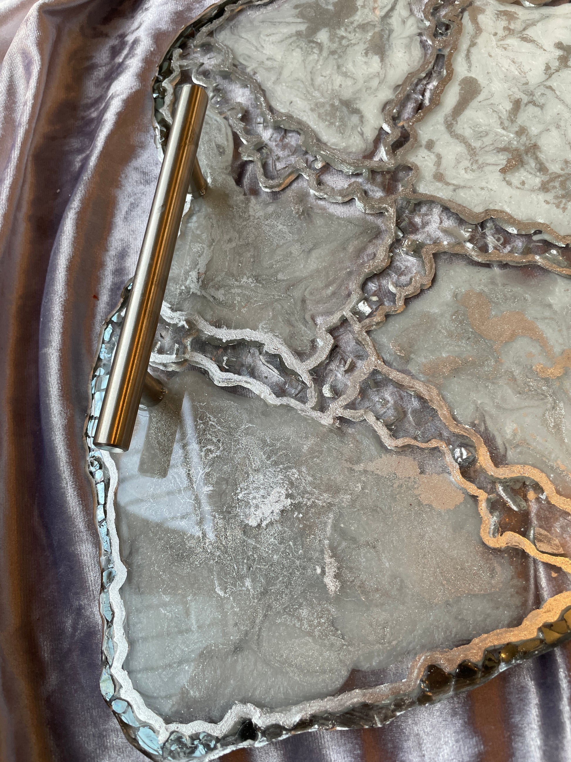 Handmade Silver and White Quartz and Glass Large Geode Resin Tray