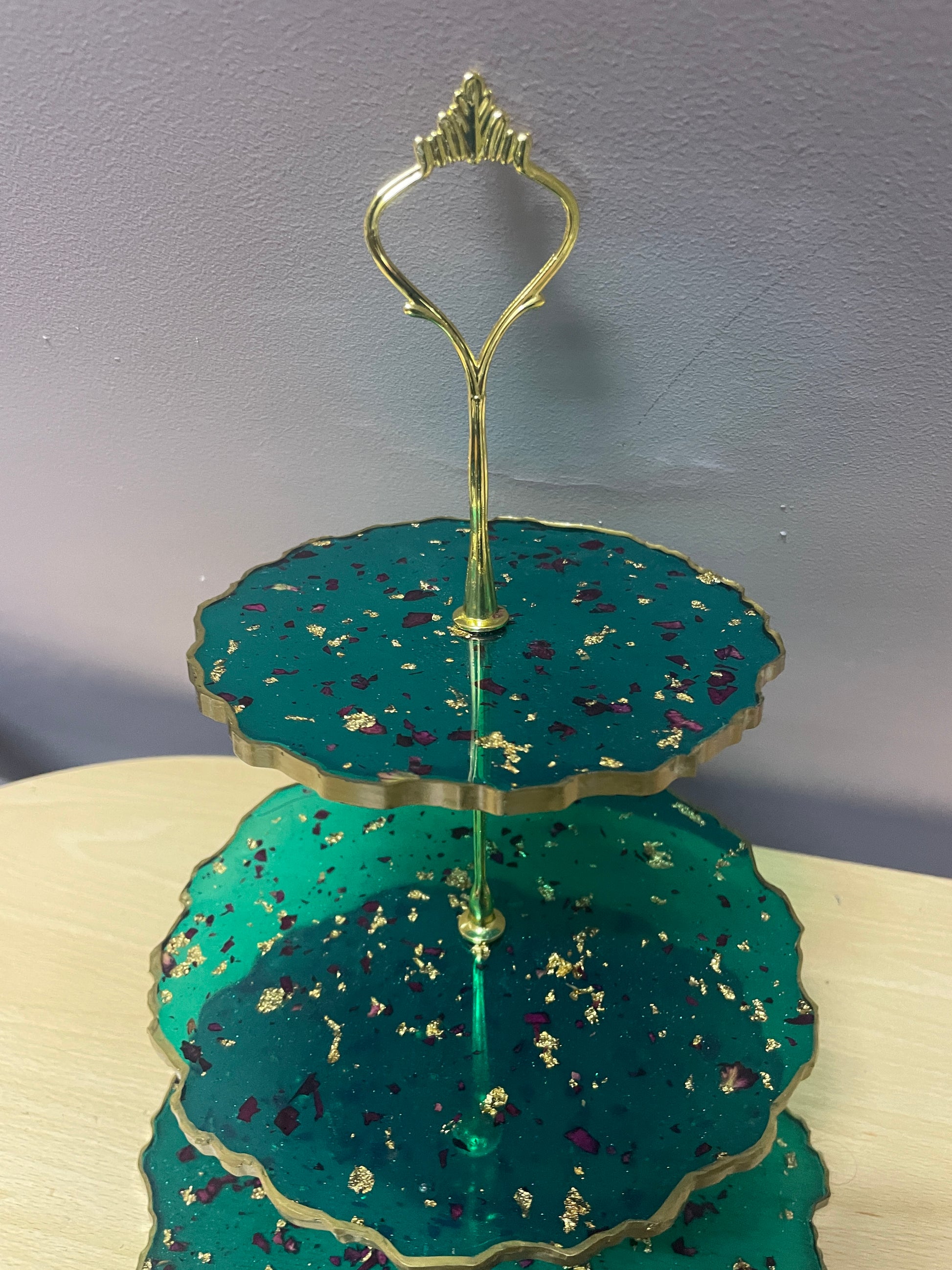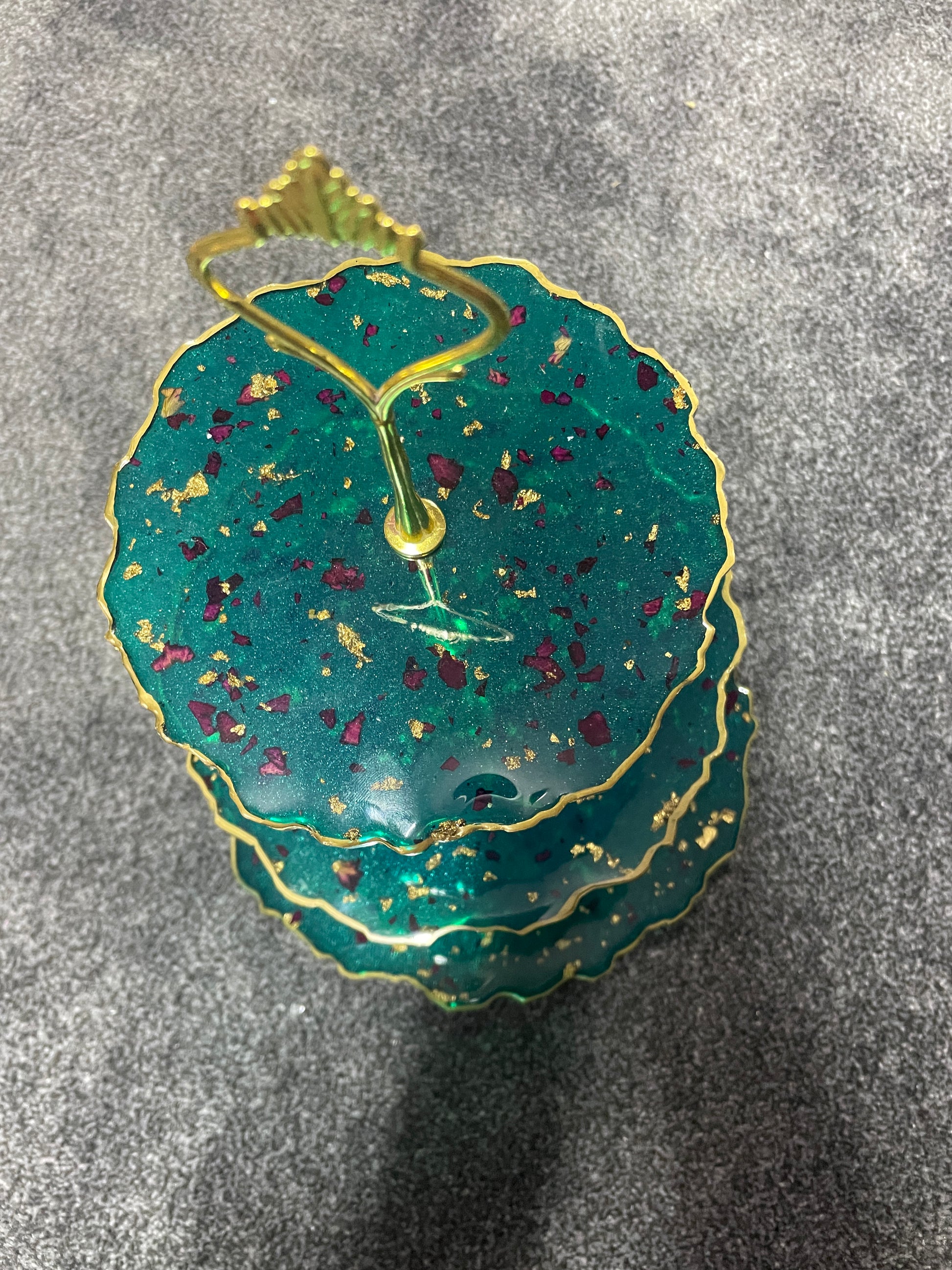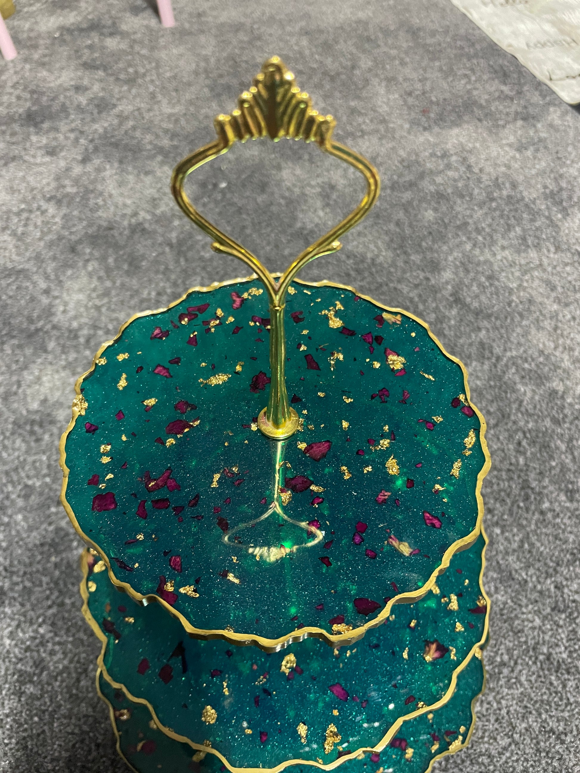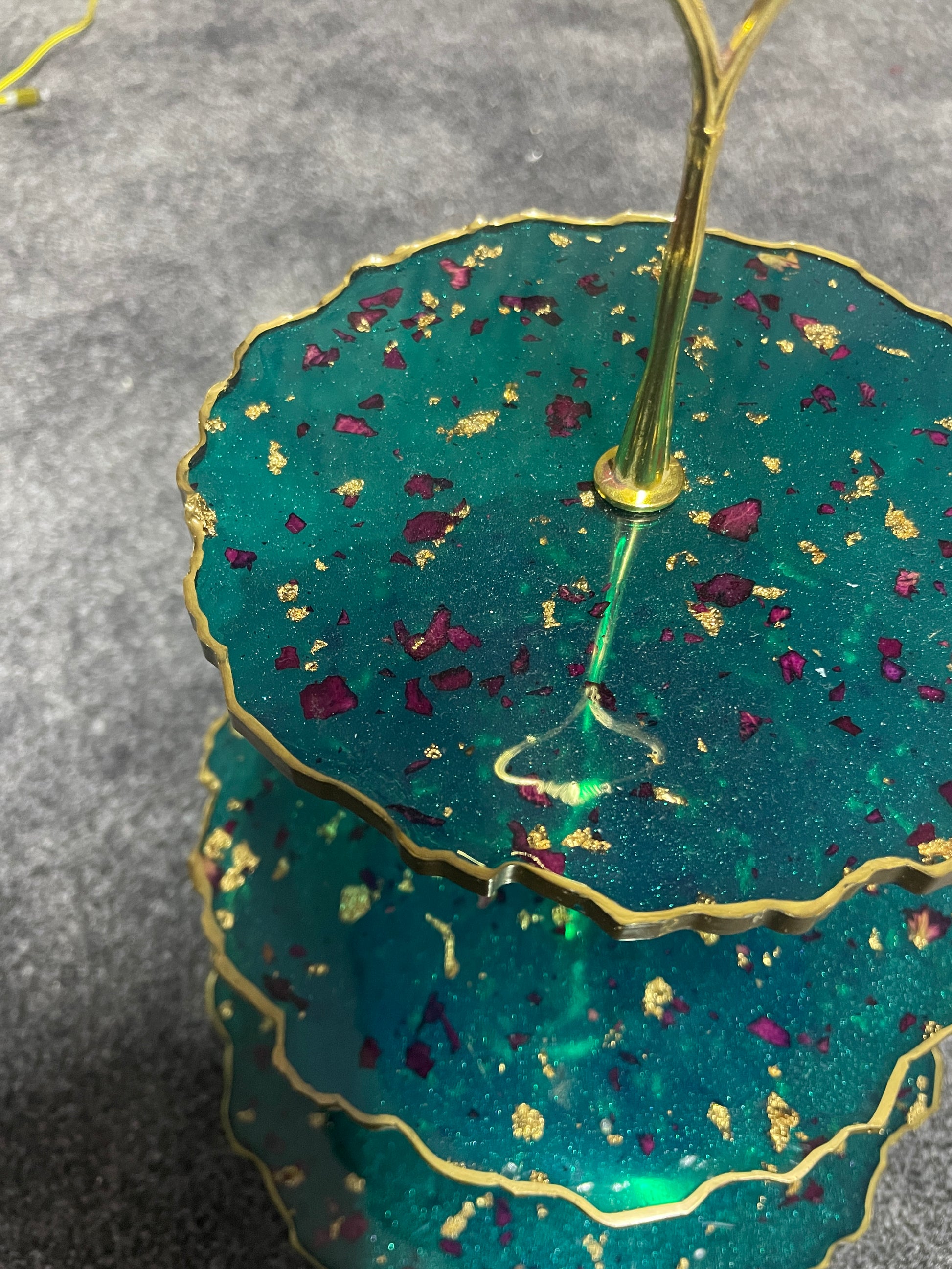 Sparkly Green with rose petals and gold flakes Three tiered Resin tray, cake stand