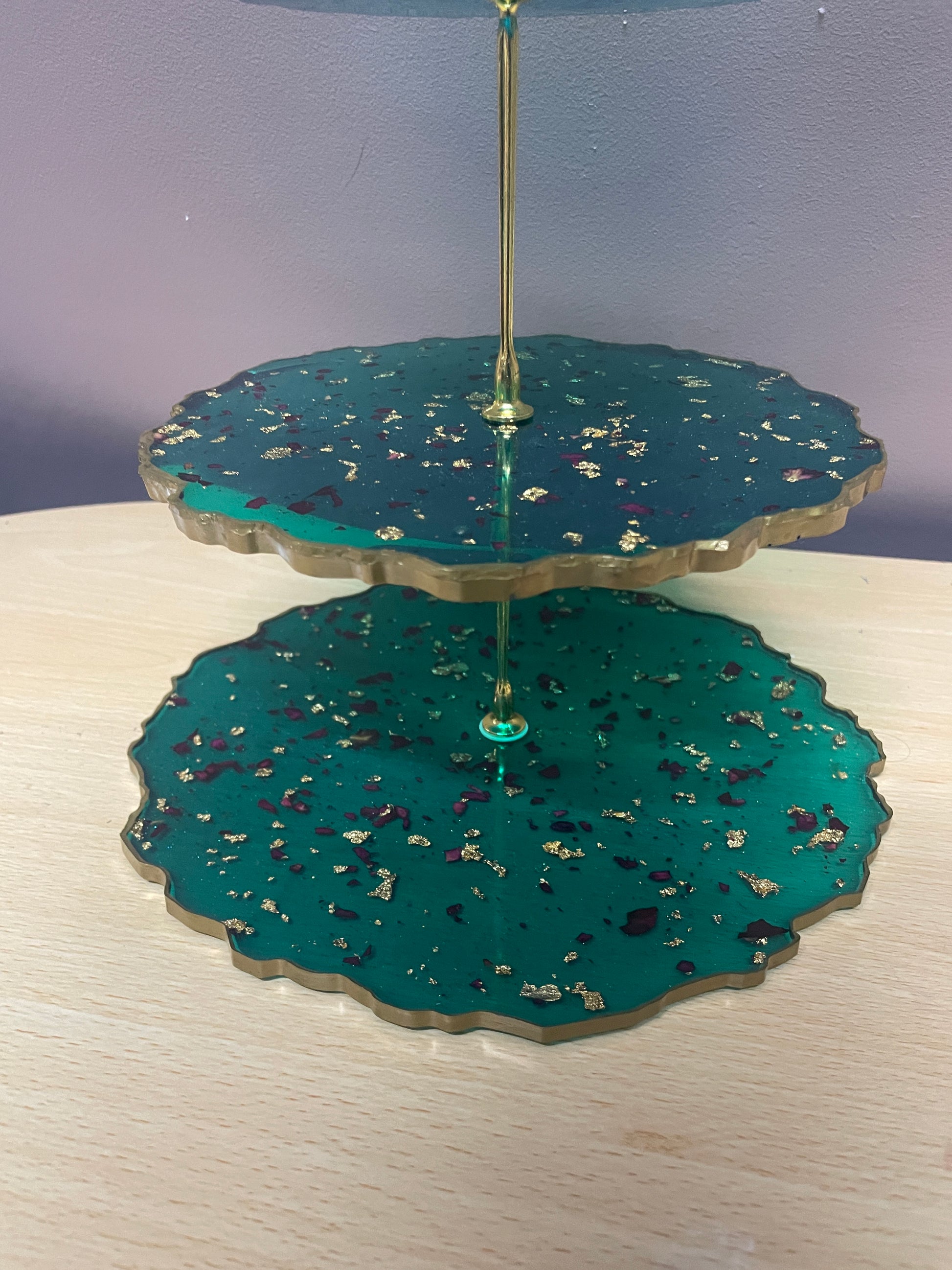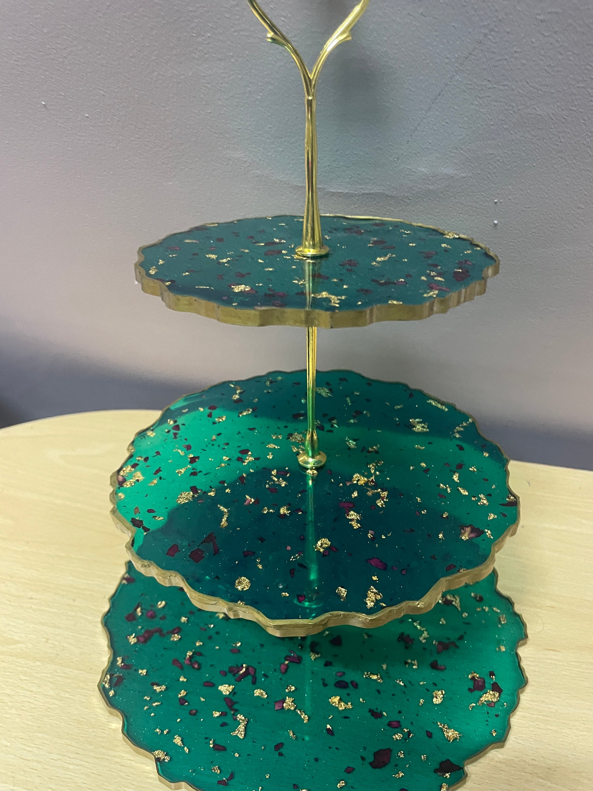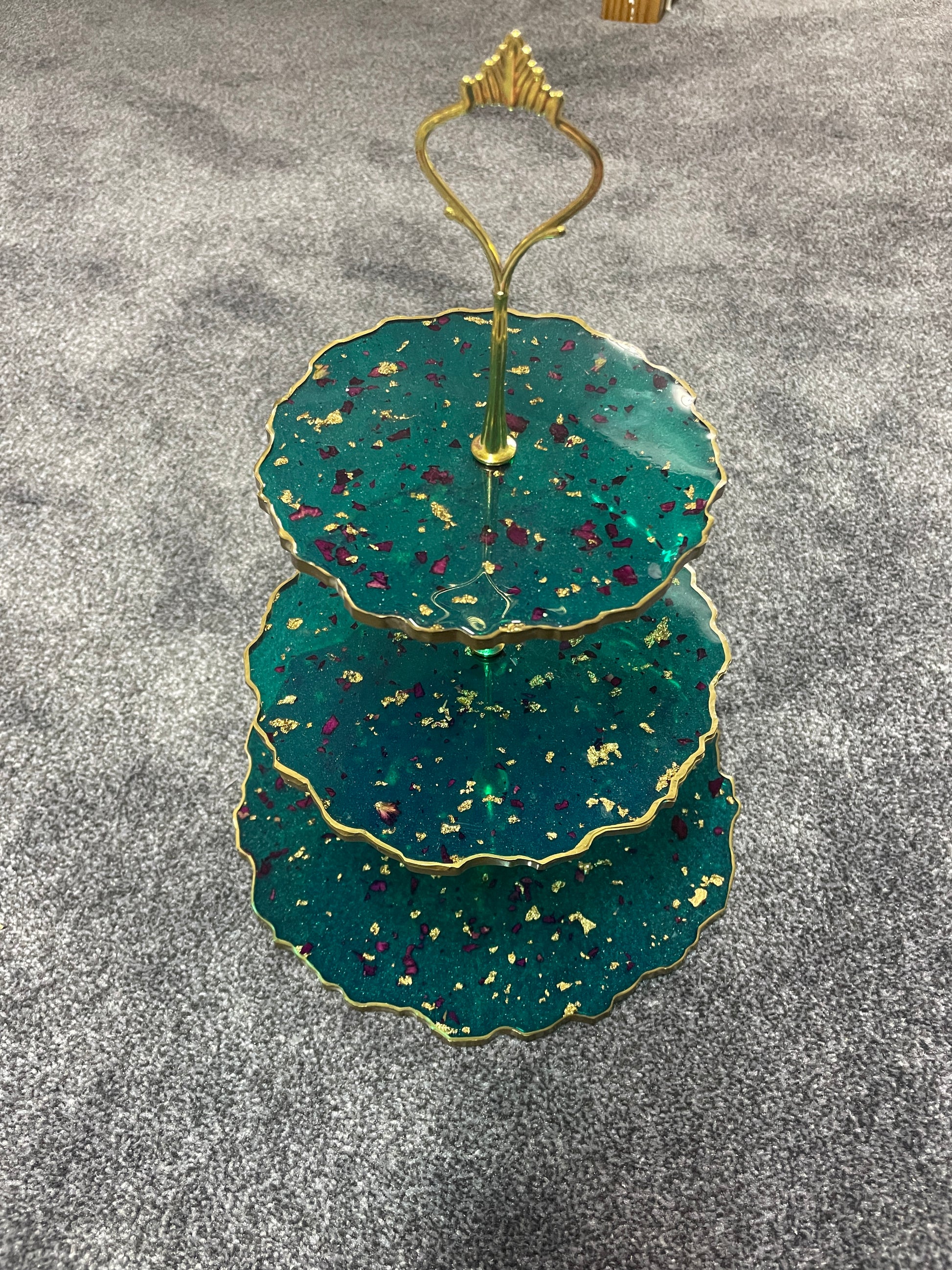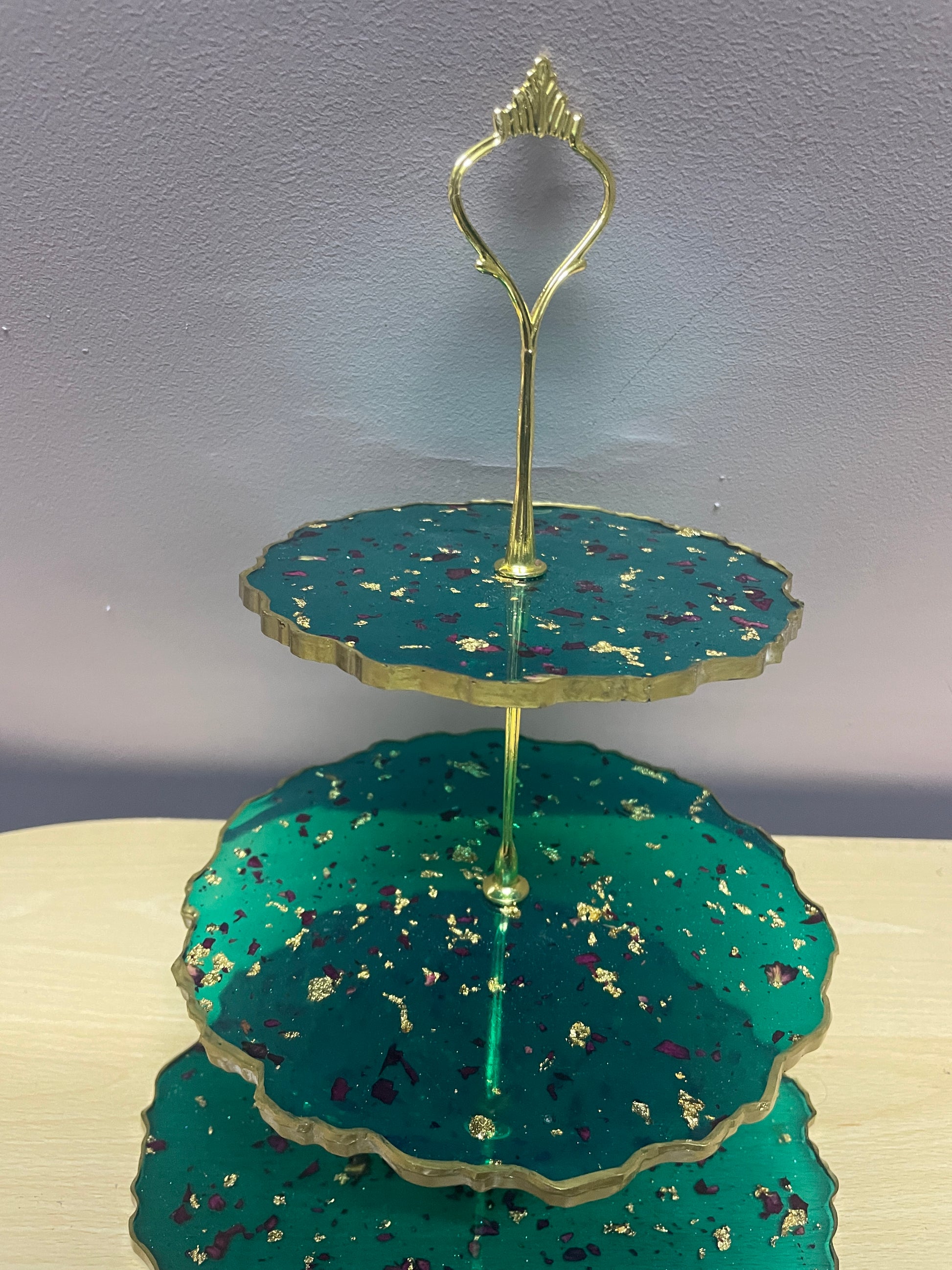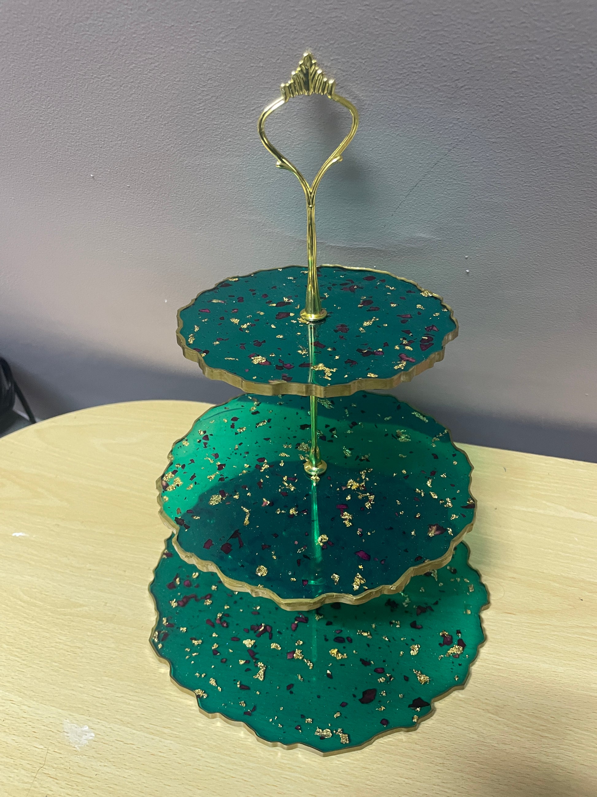 Sparkly Green with rose petals and gold flakes Three tiered Resin tray, cake stand