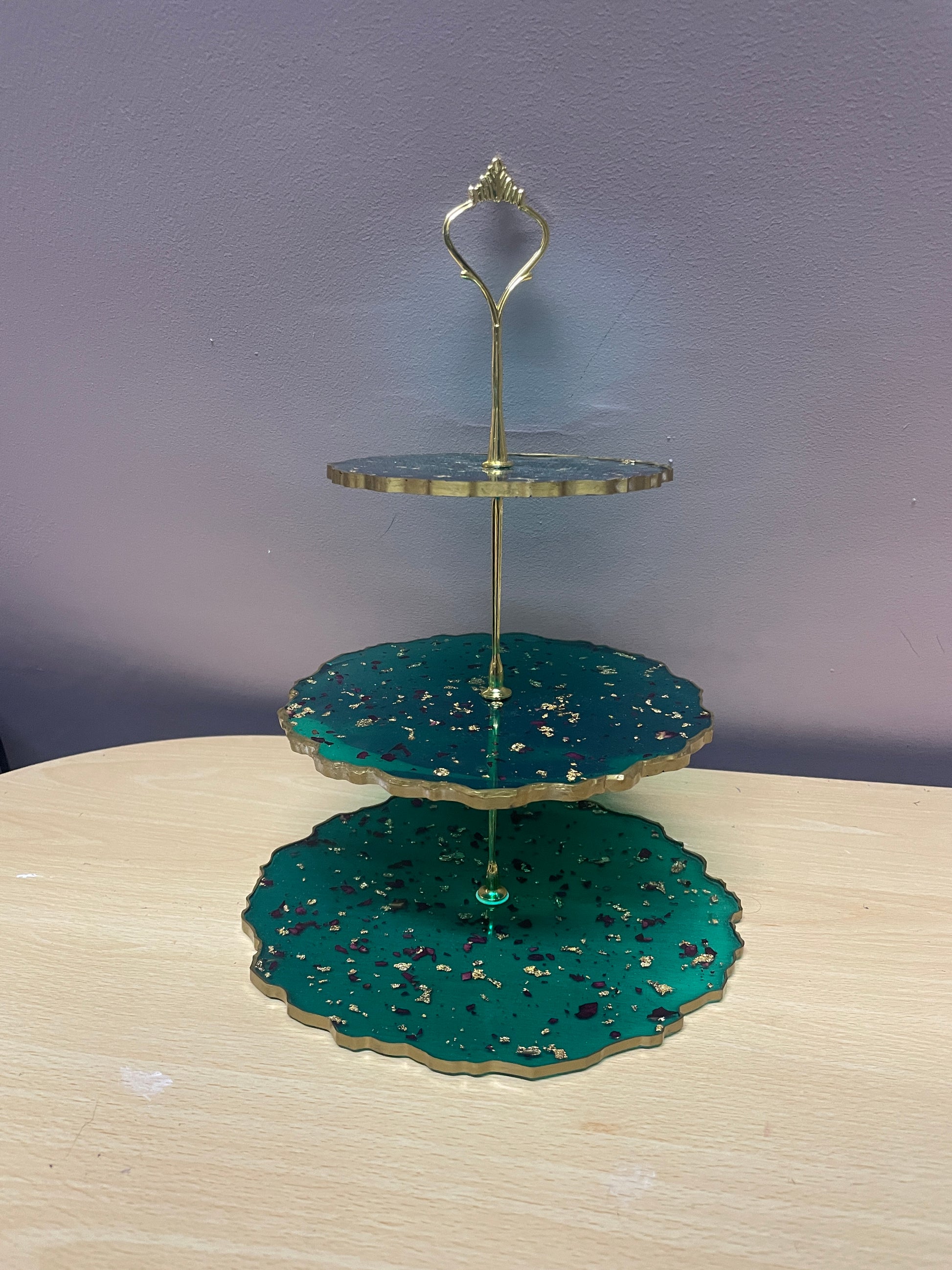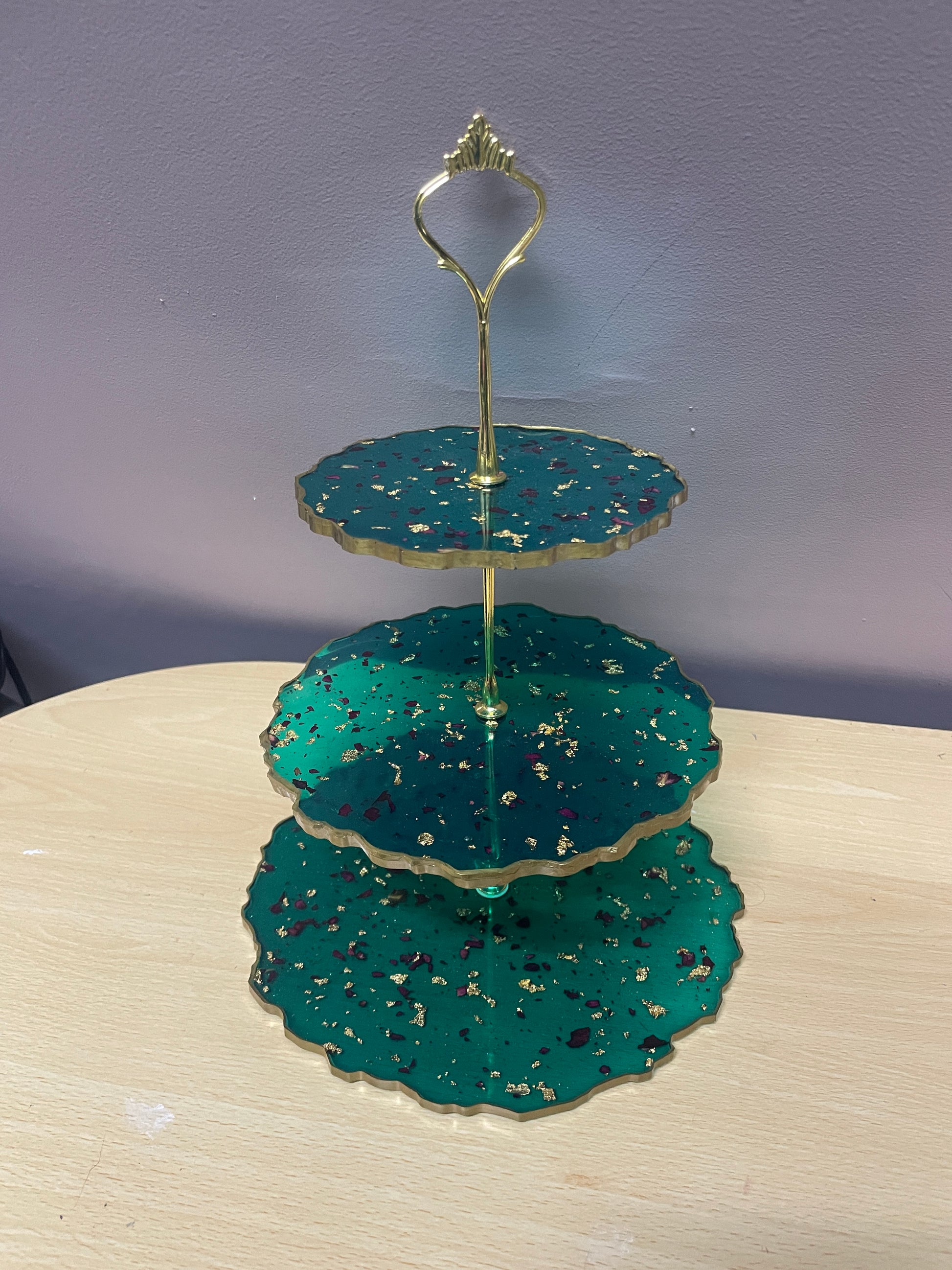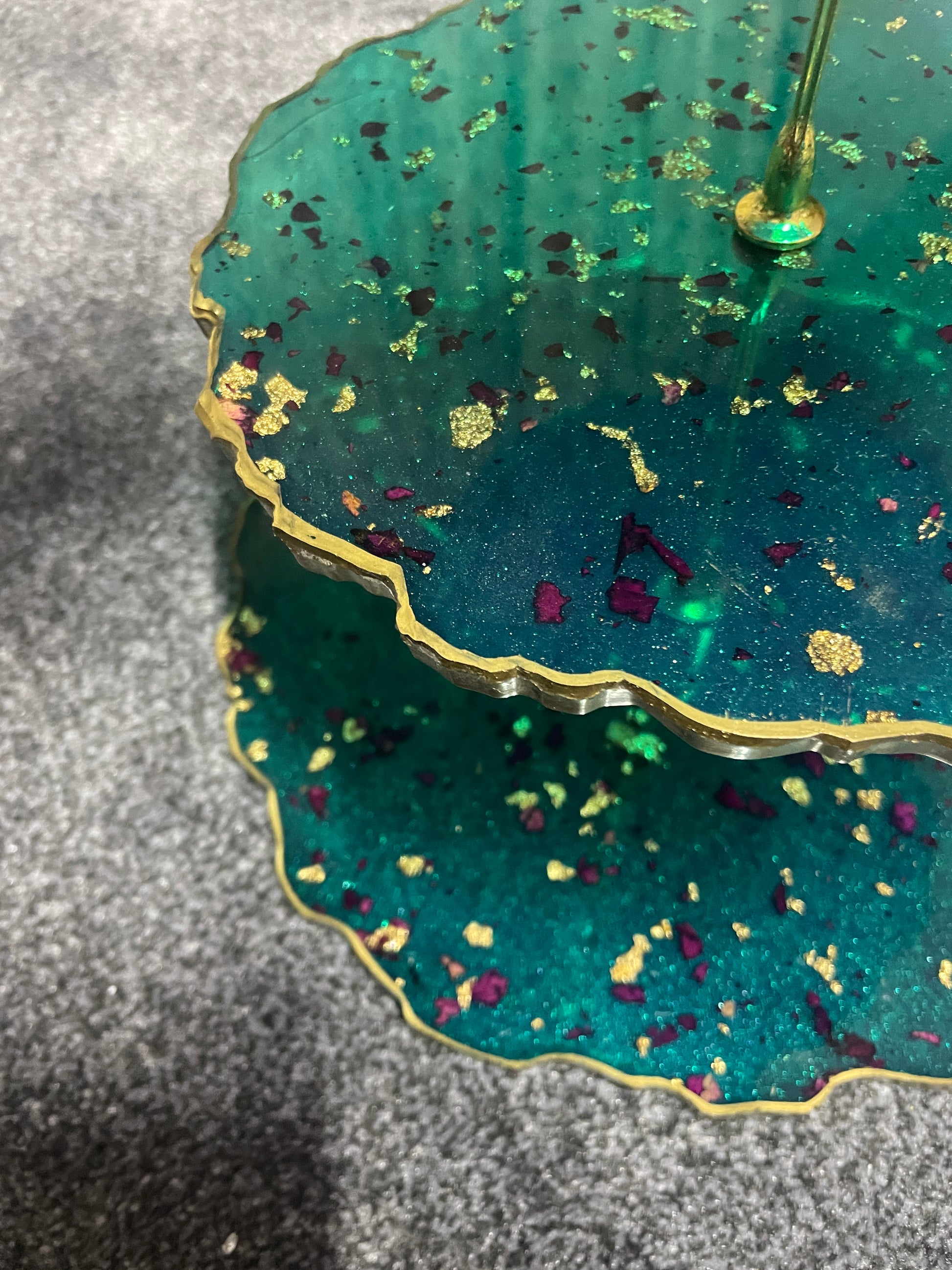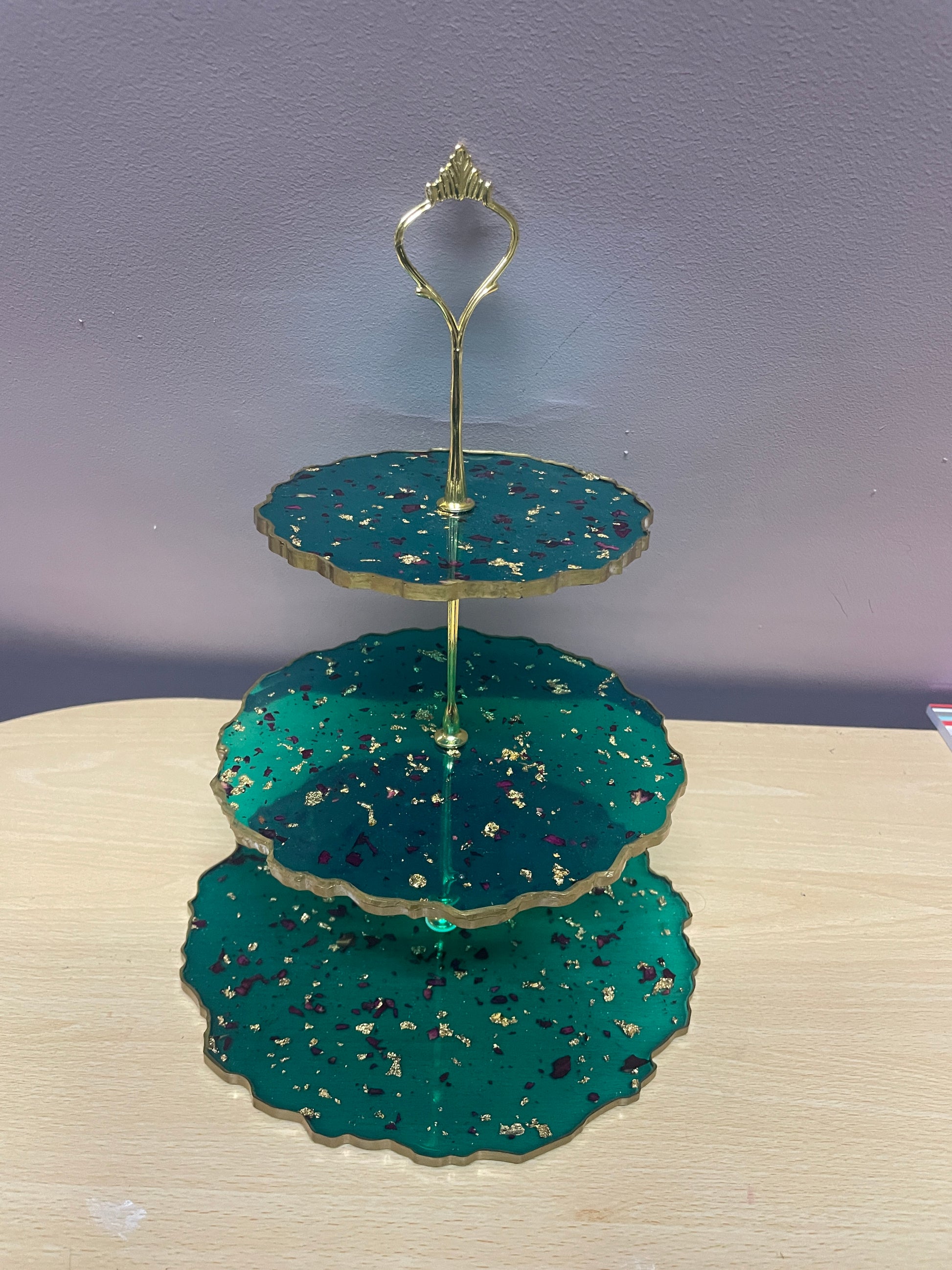 Sparkly Green with rose petals and gold flakes Three tiered Resin tray, cake stand